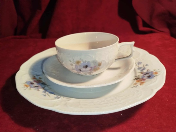 Przedmiotem sprzedaży jest filiżanka do herbaty z serii Rosenthal Sanssouci Belvedere, stan bardzo dobry - na talerzykach śniadaniowych możliwa ciemna kropka- wada fabryczna- pokazalam na zdjęciu, porcelana biała sygnowana po 1975 r. Wymiary : średnica filiżanki 9,3 cm, wys. 5 cm, średnica podstawka 14,5 cm, średnica talerzyka śniadaniowego 22 cm. Polecamy !