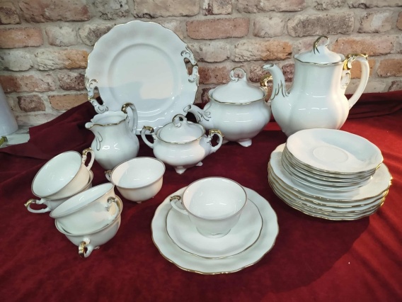 Przedmiotem sprzedaży jest przedwojenny komplet Jaworzyny Śląskiej- Koenigszelt, porcelana biała , przetarcia złoceń głównie na podstawkach , ale też mało na filiżankach cukiernicy i mleczniku, stan dobry bez obić i odprysków , wymiary : średnica talerzyków śniadaniowych 19,3, podstawek 14,5 cm, filiżanek śred. 9,5 wys. 5,5 cm, . Polecamy !